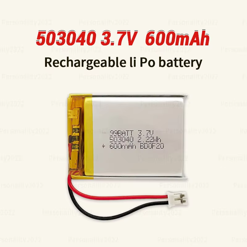 Para pedidos personalizados, contacte con atención al cliente. Marca: mydo/OEM Modelo: 503040 Peso: 6 g Vida útil: 500 ciclos Origen: China Temperatura de funcionamiento: -20-50 °C Voltaje: 3,7 V Capacidad: 600 mAh