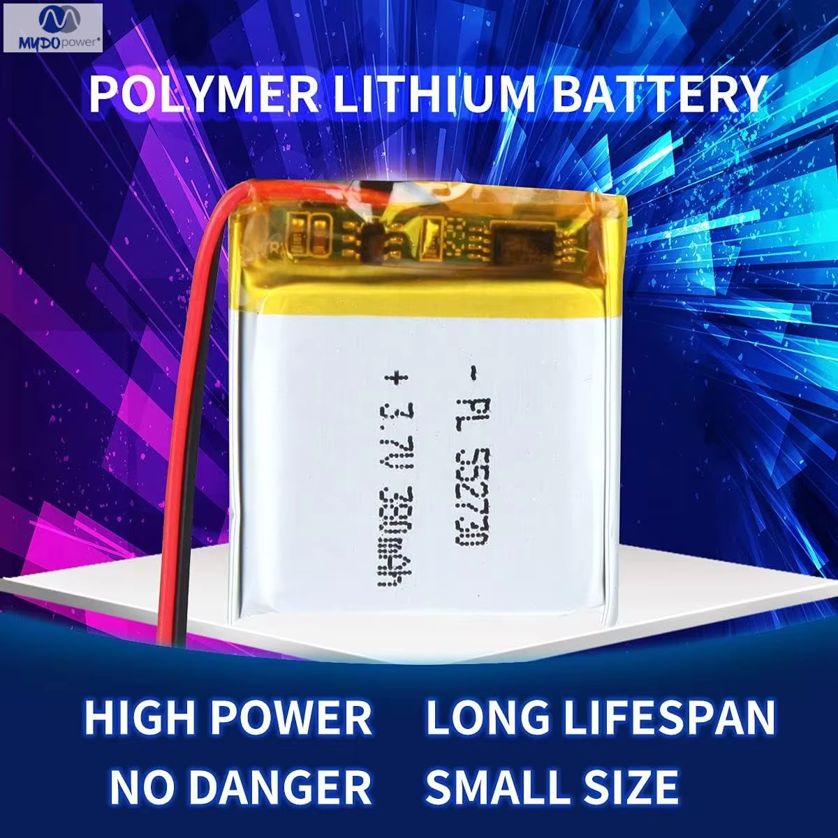 Batería de polímero de litio Tamaño de la batería: 552730, 380 mAh Aplicación: Electrónica de consumo Vida útil: 500 ciclos Materiales del cátodo: Otros Modelo: 552730 Temperatura de funcionamiento (°C): 0-45 °C Marca: Mydo Tipo de batería: Estado sólido Peso: 10 g Origen: China