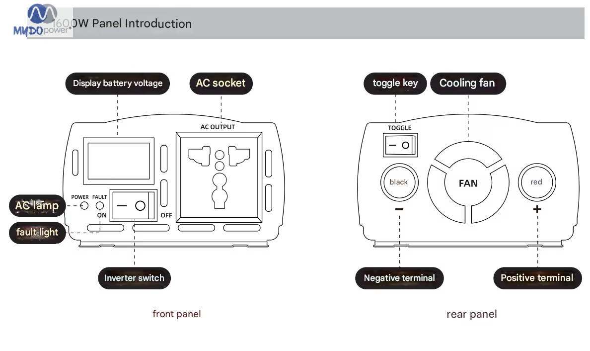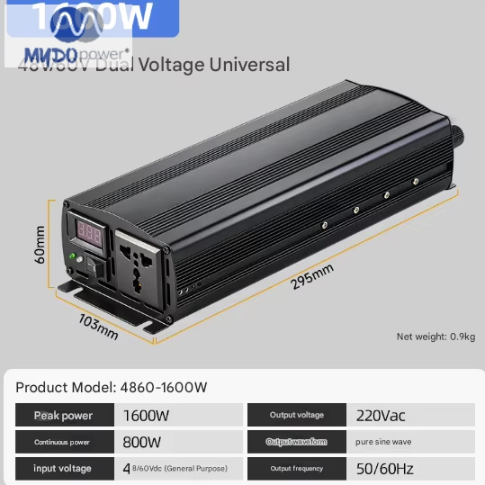 Marca: Mydo Power Modelo: GD-1600W Voltaje de entrada: 48V, 60V, 72V Frecuencia de salida: 50Hz/60Hz Tipo: CC/CA Dimensiones del producto: 26,8 x 15,3 x 7,5 cm Voltaje de salida: 220V